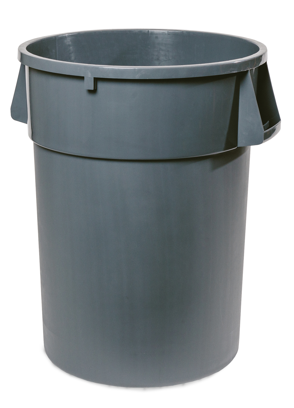 The industry Standard 32-gallon waste can. Commercial grade material and durable construction. Comfort hand grips and universal base for dolly attachment. Available in grey (-GY) and black (-BK).